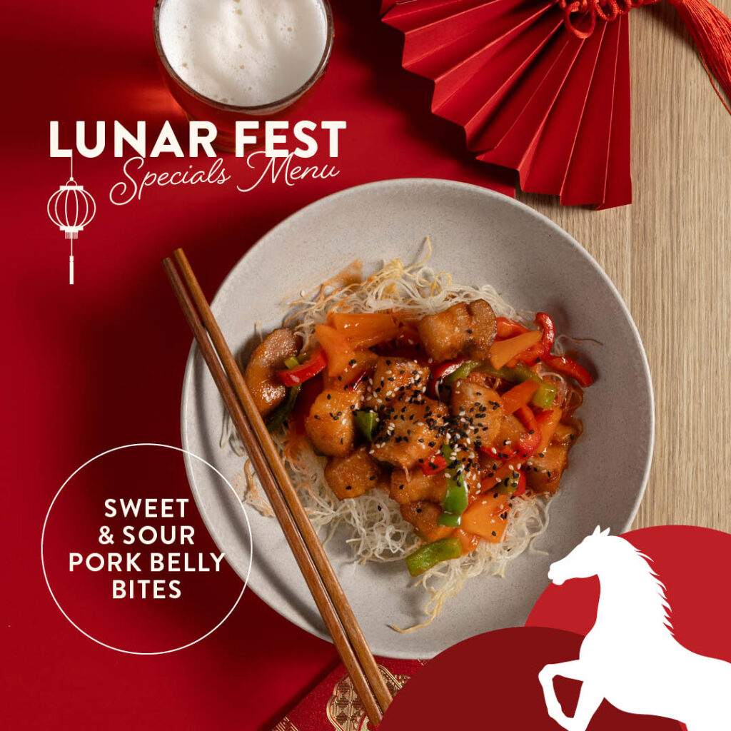 Sweet & Sour Pork Belly Bites: Crisp, caramelised, and beautifully balanced with tangy-sweet notes, finished with tender, juicy pork belly.